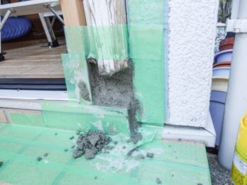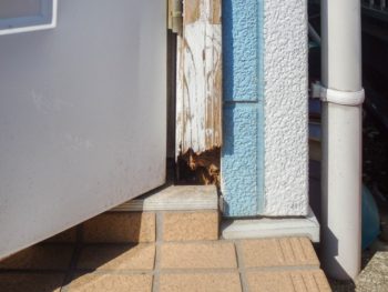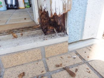 既存の木製枠の下の部分が腐食しているので処理をしてから取替をすることになります。 N様:どんな処理をするのですか? 森本:私共では腐った部分を取り除いてシロアリ殺虫剤を塗布してからモルタル(セメント)を詰める方法ですね。 N様:良かった!他の業者さんはこのまま取り替えるだけですと言われ心配だった。 |