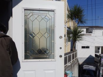 輸入の木製玄関ドアです。ステングラスが印象的ですね。