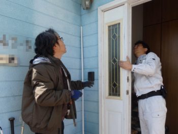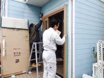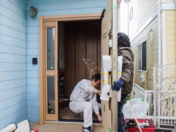 最後に玄関本体を吊り込みカギのかかりや扉の閉まる速度を調整します。