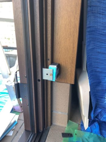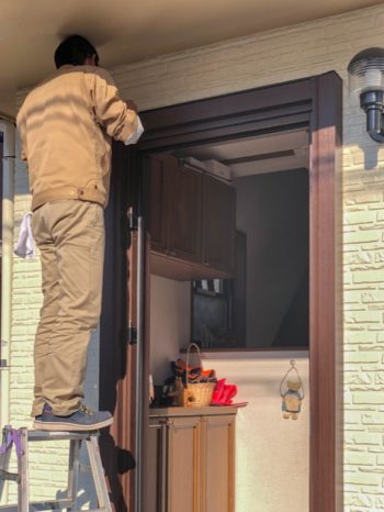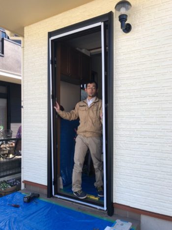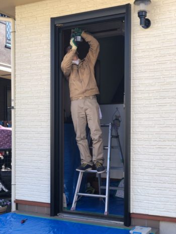 外額縁を取り付けて、ドア本体を吊り込んで、お昼休憩に入りました。