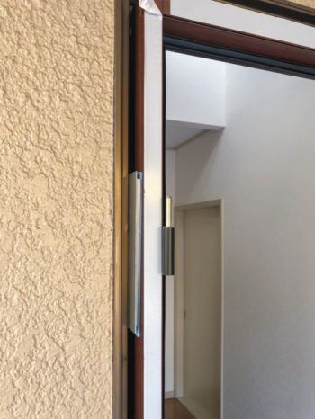 ドア本体と子扉を吊り込んで開閉スピードや錠のかかりのチェックをします。その後スマートコントロールキーのリモコンキーとカードキーの設定をします。
