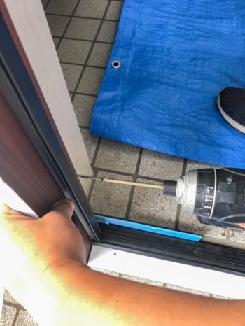 新設のドアリモ断熱枠をセットし水準器を当て水平や垂直の確認し仮固定します。