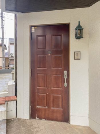木製のシンプルなドアです。外側には塗装の劣化が見られます。また、シリンダーはシングルのため防犯性もよくありません。