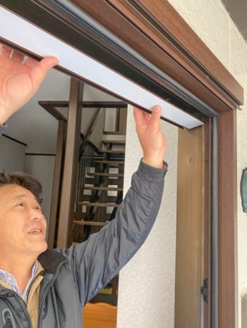 外側の化粧額縁の取付が始まりました。今、上枠上部についています。
