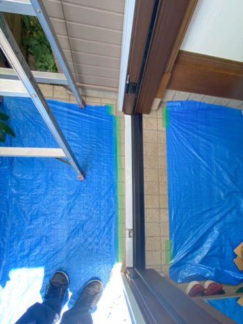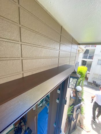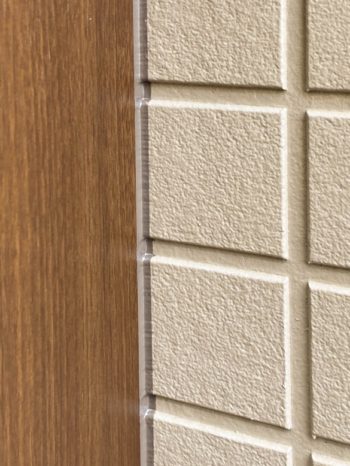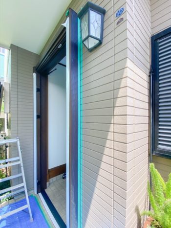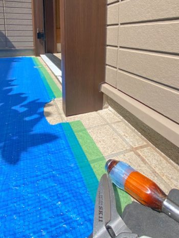 外額縁の壁との取り合いにシール処理するためマスキングテープを貼っています。