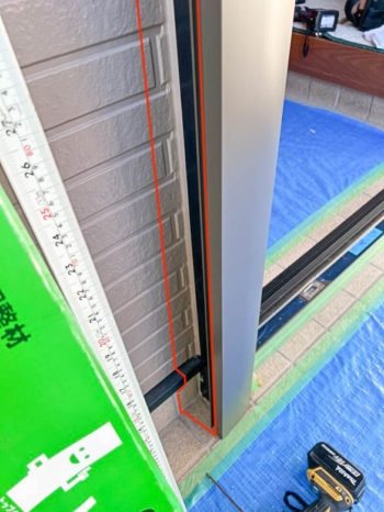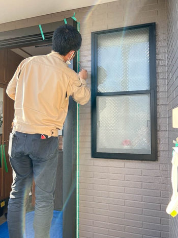外額縁が取り付けされたら、外壁との取り合い部分にコーキングを打ちます。この部分は目にみえる部分なのでヘラで綺麗に仕上げます。