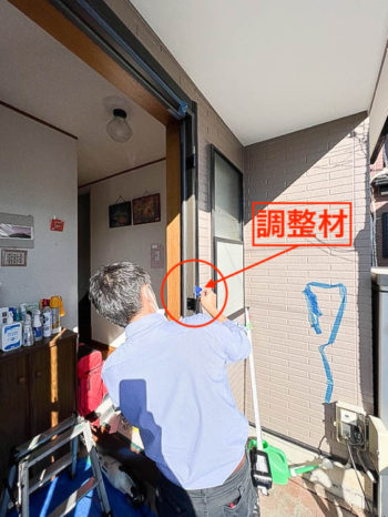半外枠補強プレートを取り付けしたのち、新規の枠をはめ込み、調整材(スペーサー)を挟み込んで垂直水平を確認後ビスで仮固定します。