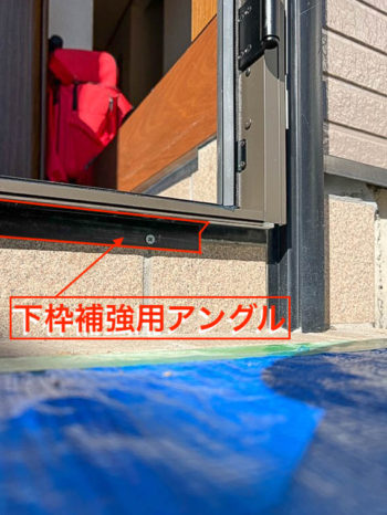 取り付けされた下枠は既存枠に枠に載っているとは言え外側に少し飛び出しているので少々不安。このまま足で乗ると下枠が下がってしまいますので、補強のためにアングルを取り付けしました。