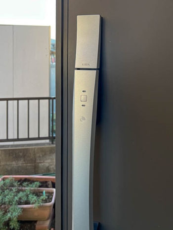 今回採用させていただいた玄関ドアハンドル錠は、ファミロックというものです。ファミロックは、カードキー、タグキー、リモコンキー、手動キーのほか売りはスマートホン対応です。専用のアプリで開閉可能なほか、登録後近くにいればスマホをポケットに入れたままでハンドルのボタンを押せば開閉可能となるようです。