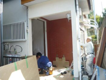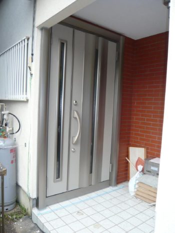 内窓設置の他に、断熱性の高い玄関ドアへの交換をご提案させていただきました。 既存の玄関ドアの周りは、写真のようにタイルにて施行されていましたので外壁はそのままで工事ができるカバー工法にてご提案いたしました。 既存の四方枠以外はすべて撤去し、一周り小さく用意した新しい断熱枠を設置。もちろん扉も断熱性の高いものに交換します。最後に枠の周りに額縁を設置しますのでリフォーム後には、既存のドア枠は完全に見えなくなります。 |