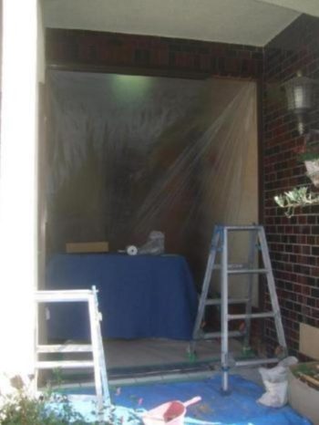 袖、ランマなど全てを外し枠のみになりました。室内が汚れないようビニールで大きく養生をします。