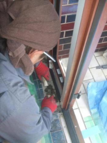 スタッフのトザワがコーキングにて防水処理をしているところです。この後、内外に化粧額縁を取り付けます。