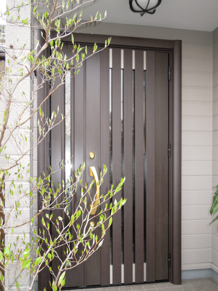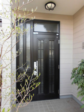 落ち着いたカラー(柿渋色)の素敵な玄関ドアの完成です。親子タイプの玄関ドアに変わったので大きな荷物も搬入できるようになりました。