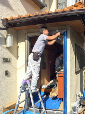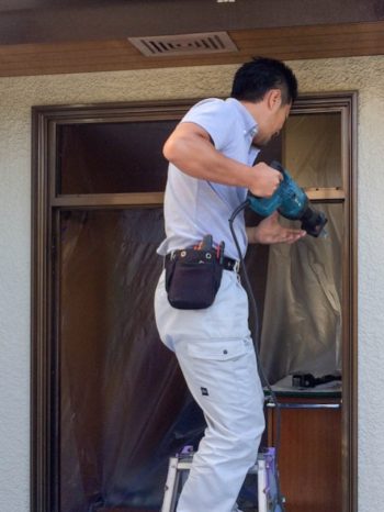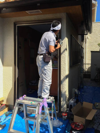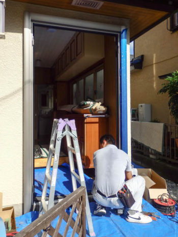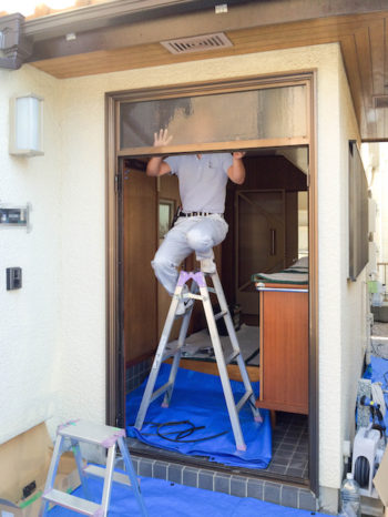 古い玄関枠は、外額縁でカバーします。工事後にはもう既存の枠は隠れて見えなくなってしまいます。