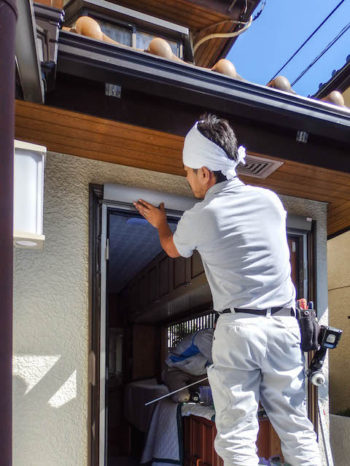 マスキングテープを貼って外額縁と外壁の隙間もしっかりとコーキングします。