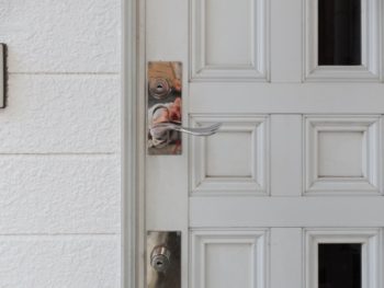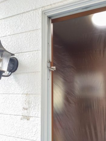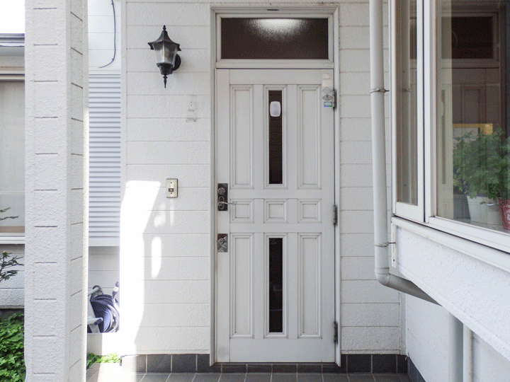 既存の玄関ドアは、ランマ付き片開きホワイト色の玄関です。