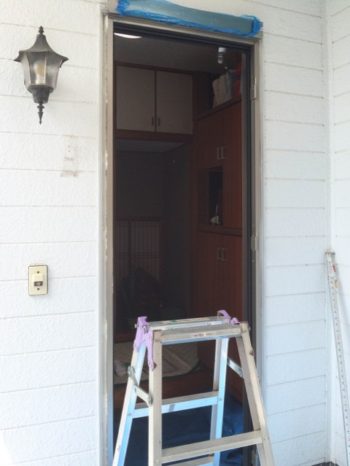 スタッフ/マルヤマ まずは、玄関ドア本体とランマのガラスを外しました。