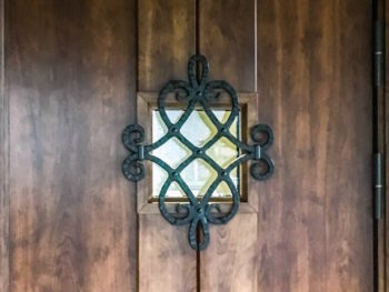 小窓にお洒落な鋳物格子がロートアイアン調のハンドルと共に似合います。