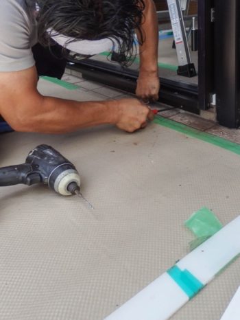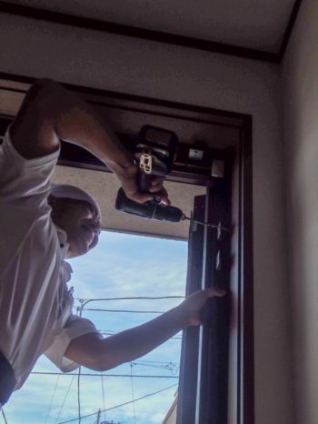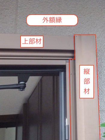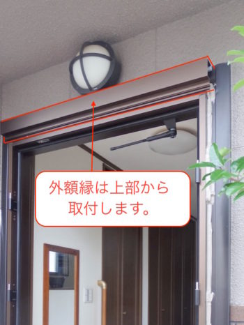 【外側】上枠に外額縁の取付をします。新設枠と壁の出具合によっては切断します。
