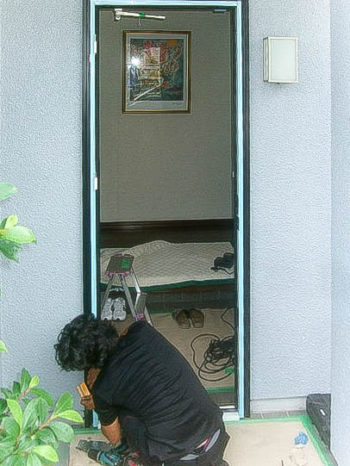 カバー工法による玄関リフォームがスタートです。玄関本体、既存の枠周りに付いている部品を外して新規の玄関枠をチリを均等にしながらスペーサーを挟み込み固定していきます。