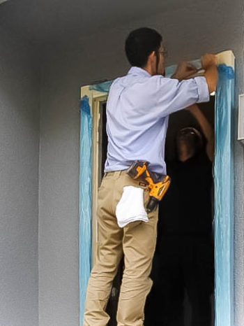 内・外額縁固定中(この辺りから、店長のモリモトは2階のバルコニーのデッキ材交換にかかりました。)