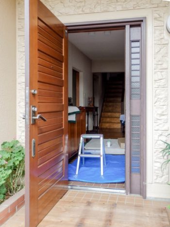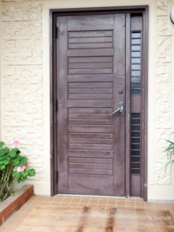 | お客様のご要望 | 既存のドアは木製のため、何度か塗装したそうです。「玄関に庇もあるが、風当たりが強く雨に相当あたってしまってね。ハンドルも壊れている状態で・・・」 とかなりお悩みのご様子でした。 |