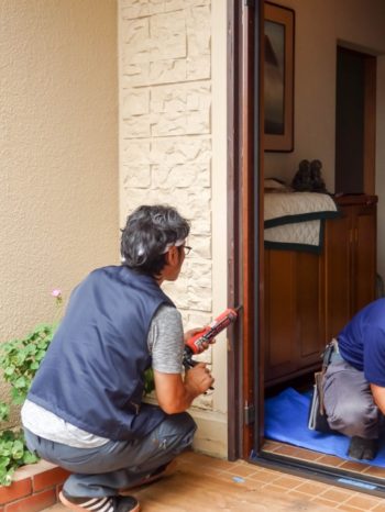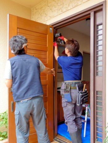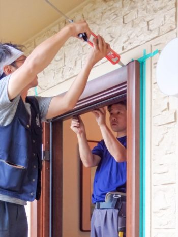内外の額縁を取付けて回りを丁寧にシールし、扉の開閉状態・鍵の掛かり・ドアクローザーのスピードの調整をし完成です。