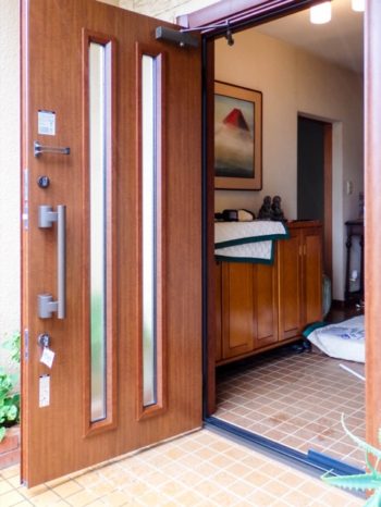W様は事前に「LIXIL相模原ショールーム」で玄関ドア交換工事のご説明を受けており「リシェント300型 ポートマホガニー色」を気に入られたご様子でカラーコピーの資料を手渡してくださいました。 ご希望の親子タイプ、片袖タイプでは制作限界の問題があり制作ができませんでした。そのため「単体ドアタイプ」をお薦め致しました。 |