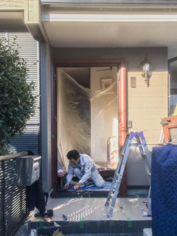 まずは玄関ドア本体・小扉を撤去し既設枠に取り付いている金具類もすべて取り除いていきます。