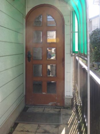 | お客様のご要望 | 今のドアは木製で、何度も塗りなおしをしているのですが、西日で焼けてしまうので、アルミ製のドアにリフォームしたい。 また、以前は店舗の出入り口として使っていたこともあり、アーチ型のフレームなのですが、カバー工法でリフォームできますでしょうか・・・。 なるべく安くしたいので、安価なドアでお願いしたい。 そんなご相談を頂戴しました。 |