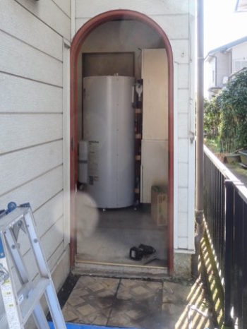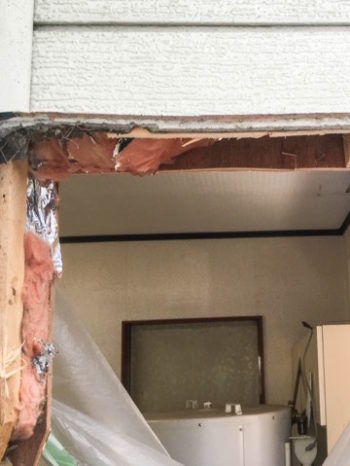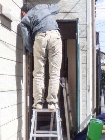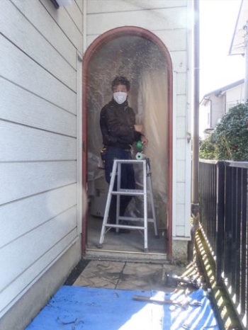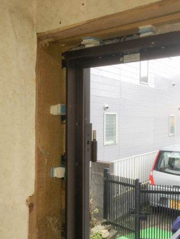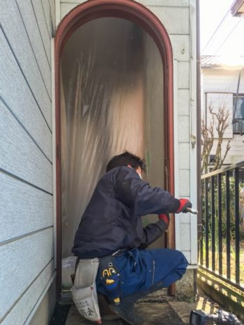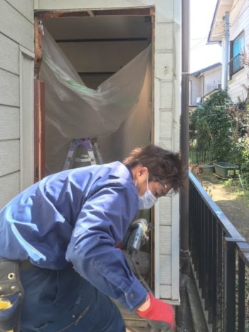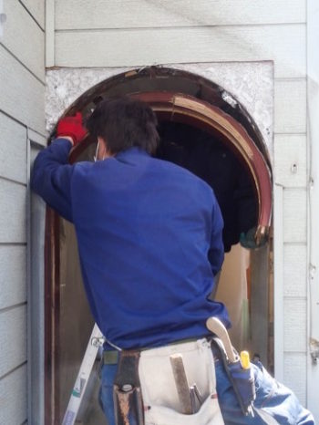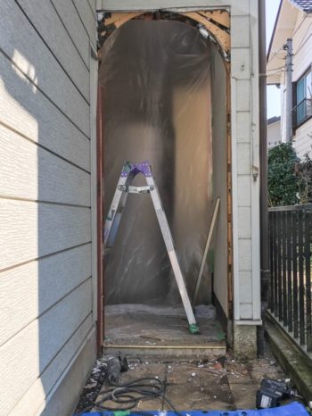 半円形のドアから四角い通常タイプのドアに取り付け直すため外壁から玄関枠の一部を取り除きました。