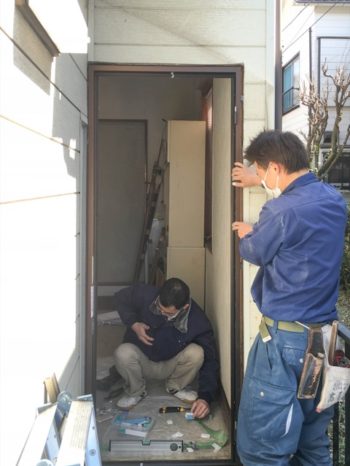 工事開始。まずはドア本体を撤去し、枠の金物類も取り外します。