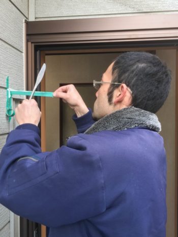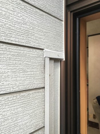 外観左側が入り隅だったため外額縁の縦材を外壁に合わせ切断加工しています。少し削っては、あてがって・・・の繰り返し作業です。