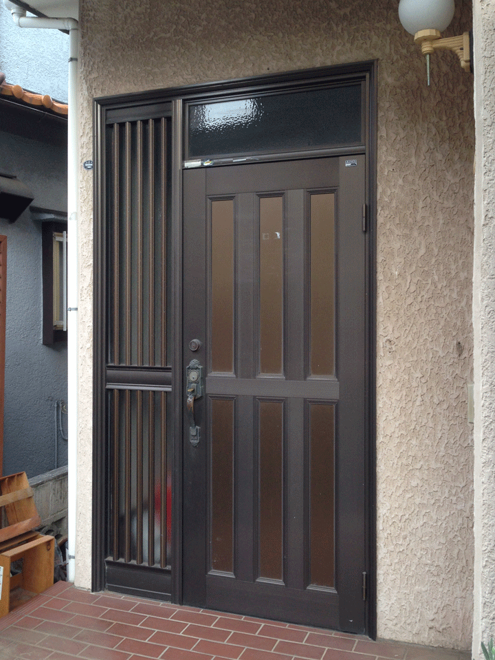 【工事前】ランマ付き片袖飾り格子付き玄関ドアです。