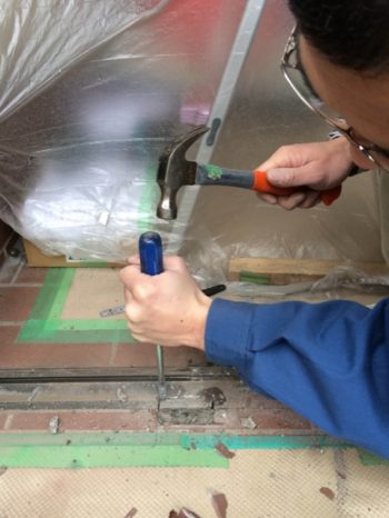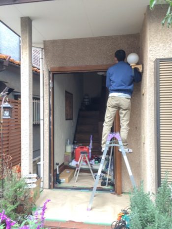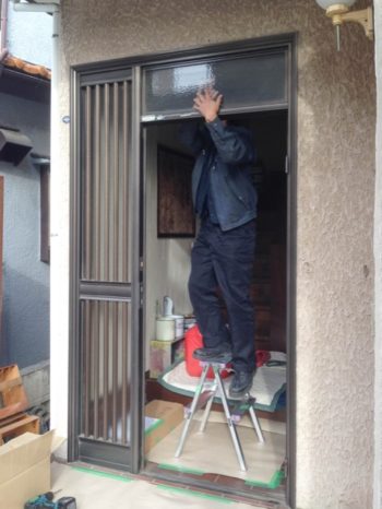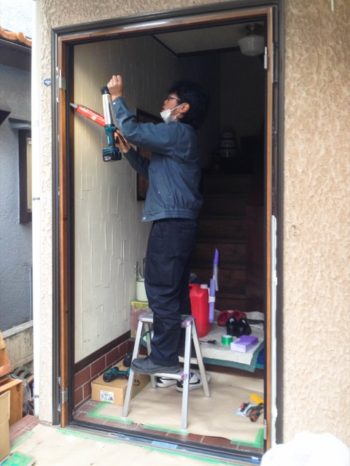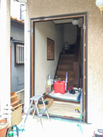 玄関ドア本体を撤去しランマガラスを取り外しています。新設枠をはめこむための開口を作っています。