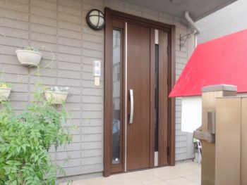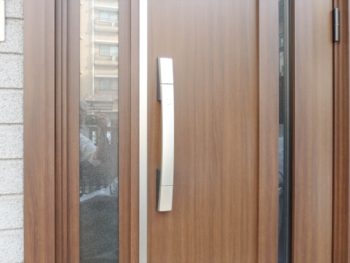 | 使用商材 | YKKAP ドアリモS29v断熱タイプ通風仕様、ショコラウォールナット(木目調本体)、枠は通常プラチナステンのところ本体と同じ仕様に、スマートコントロールキー(ピタットキー) |