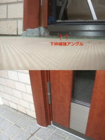 本体と新規枠のチリを確認するために本体を吊り込み、開閉に問題がないか確認します。そして、コーキング処理をします。