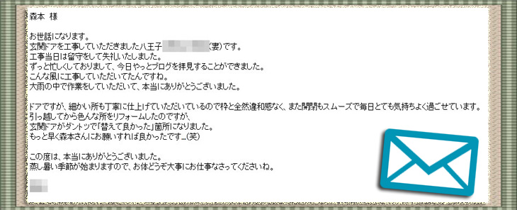 お世話になります。玄関ドアを工事していただきました八王子○○の○○(妻)です。