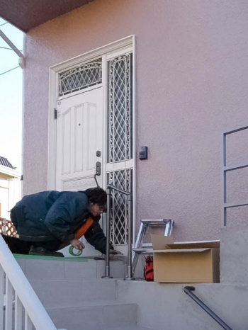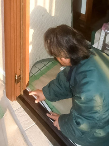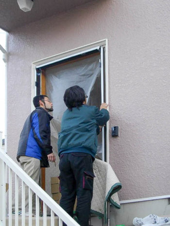 店長/モリモトも一緒に新しく用意した、木目調の玄関枠を設置するところです。