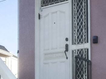 工事前の写真です。ホワイト色のアルミ製玄関ドアです。こちらのドア本体の中身は空洞のため、結露も多く発生していたとのことでした。