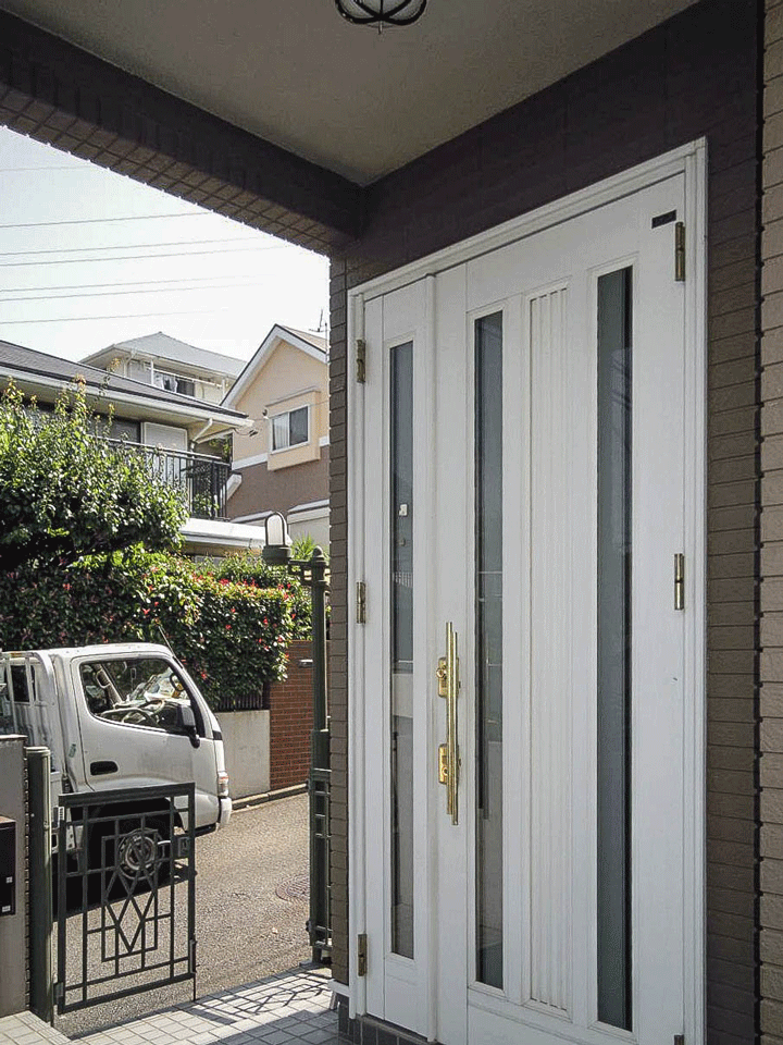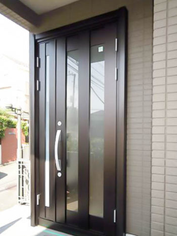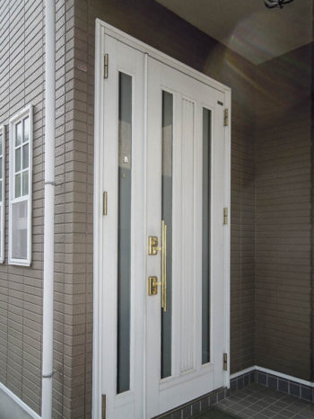 モリタケウインドセンターでは、LIXIL/YKKAP/三協アルミ社すべてのメーカーの玄関ドアを取り扱っておりますので、W様のご希望の玄関を選んでいただけるよう各メーカーのカタログからご検討いただき御見積書も数パターン提出させていただきました。 最終的には、デザインや製作限界寸法など様々な観点から三協アルミ社のラフォースR2 09型に決定いたしました。外壁やタイルなど一切壊さないカバー工法による玄関ドアリフォーム工事です。 |