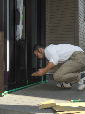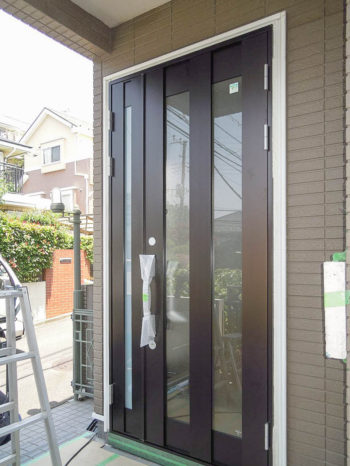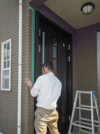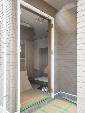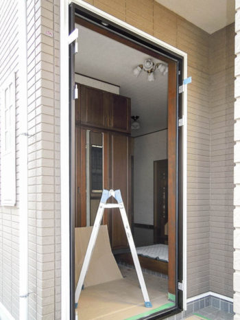 新しい玄関を吊り込んだところです。この後、ドア周りの白い部分(既存枠)を外部額縁でカバーをして隠します。