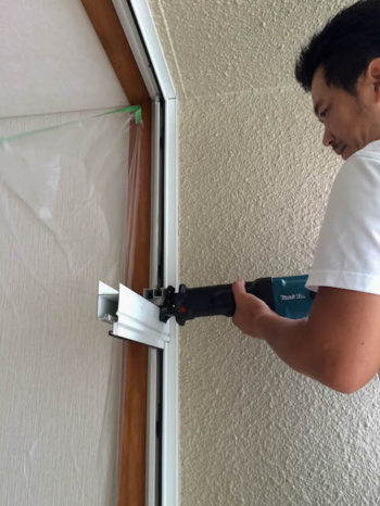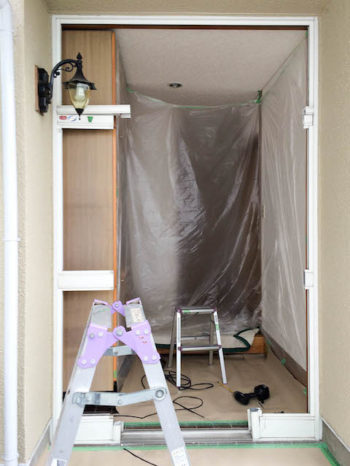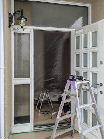 まずは、室内外の養生をして玄関ドア本体をこれから外し、袖部とランマ部の無目の解体に入ります。