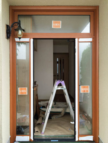 外額縁も同時進行で加工取付しました。そして、ランマと両袖のガラスも入れました。3枚のペアガラス設置完了です。