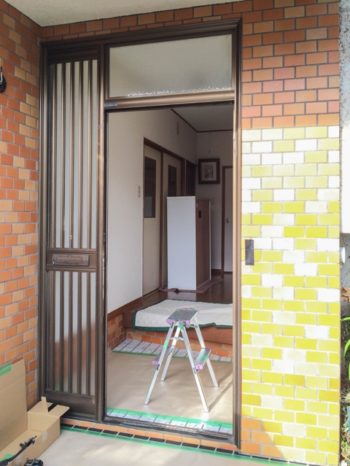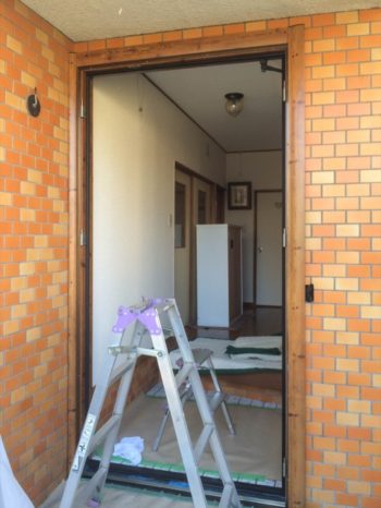 ドア本体やランマガラス等を外し新規枠をはめ込むための開口を作ります。
