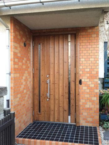 製品:LIXILリフォーム玄関ドア リシェント 型番:800型 仕様:断熱K4 親子タイプ 色:アイリッシュパイン(木目調) ハンドル:G2J型バーハンドルの完成です。とても素敵な玄関に仕上がりました。