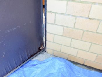 経年劣化のため、扉の1部が裂けた状態で歪んでいます。鍵もかかりにくい状態でした。