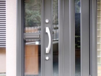 | 使用商材 | LIXILリシェント玄関ドア アルミ仕様 P2型オータムブラウン色 片袖ポスト付き仕様 ムーン型ハンドル |