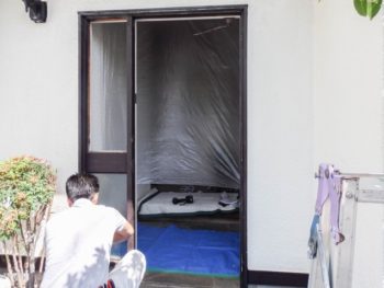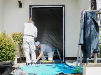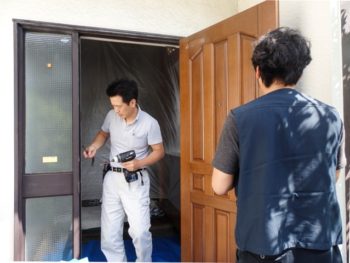 工事担当のスタッフ/トザワとマルヤマ、まずは内外の養生からスタートです。