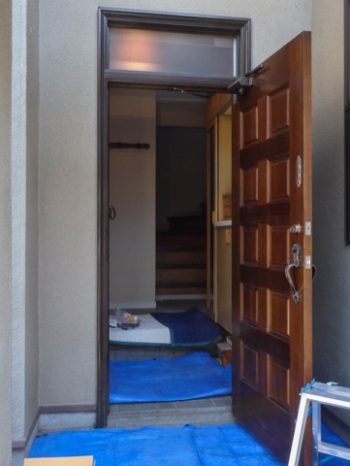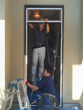 作業開始です!扉の撤去とランマ付きの場合、ガラスの取り外しを行います。
